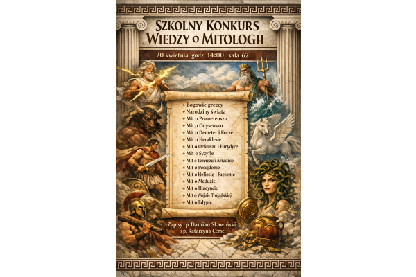 Serdecznie zapraszamy uczniów klas IV-VIII interesujących się mitologią grecką do wzięcia udziału w I edycji Szkolnego Konkursu Wiedzy o Mitologii. Zmagania odbędą się w poniedziałek, 20 kwietnia o godz. 14:00 w sali 62. Konkurs organizują p. Katarzyna Cemel i p. Damian Skawiński. Uczestników obowiązują zagadnienia wymienione na plakacie. Pierwszy etap konkursu będzie miał formę interaktywnego quizu w aplikacji Kahoot! (dlatego prosimy, by uczestnicy mieli ze sobą w miarę możliwości telefony z dostępem do Internetu). Następnie trzech najlepszych uczniów weźmie udział w rywalizacji rodem z teleturnieju "1 z 10", tak aby wyłonić najlepszego w szkole znawcę mitów greckich. Zapraszamy!