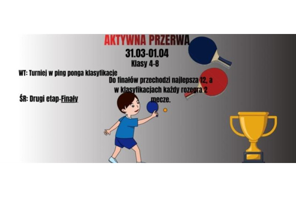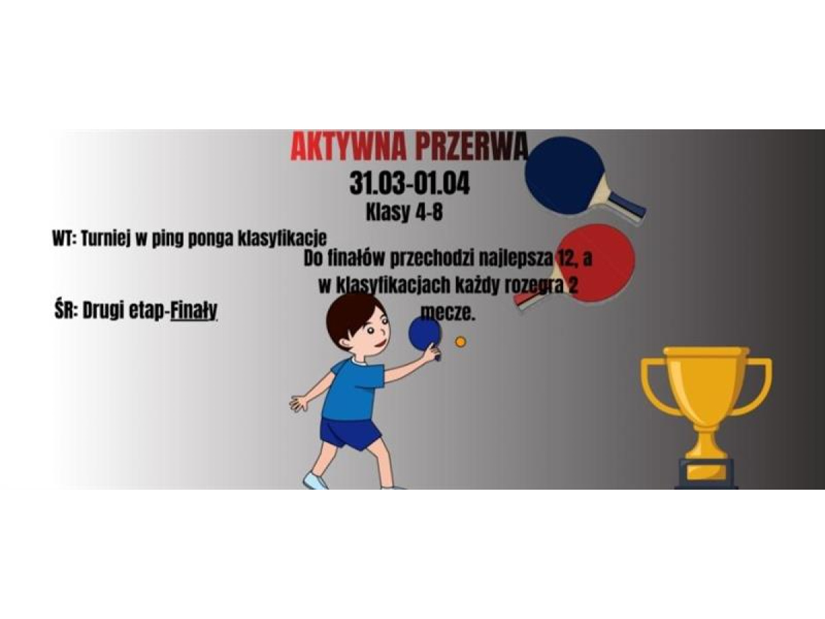 Przed nami kolejny tydzień aktywnych przerw. Tym razem odbędzie się turniej w ping ponga oraz finały i klasyfikacje, w których rozgrywane będą mecze.
