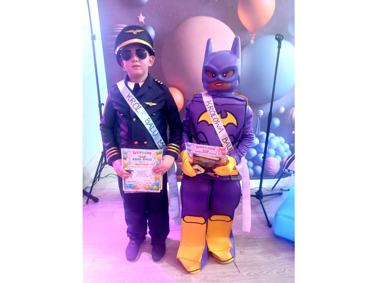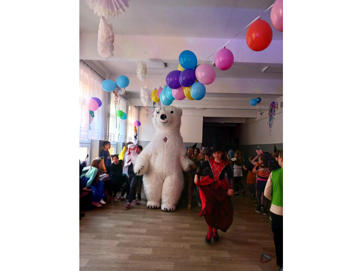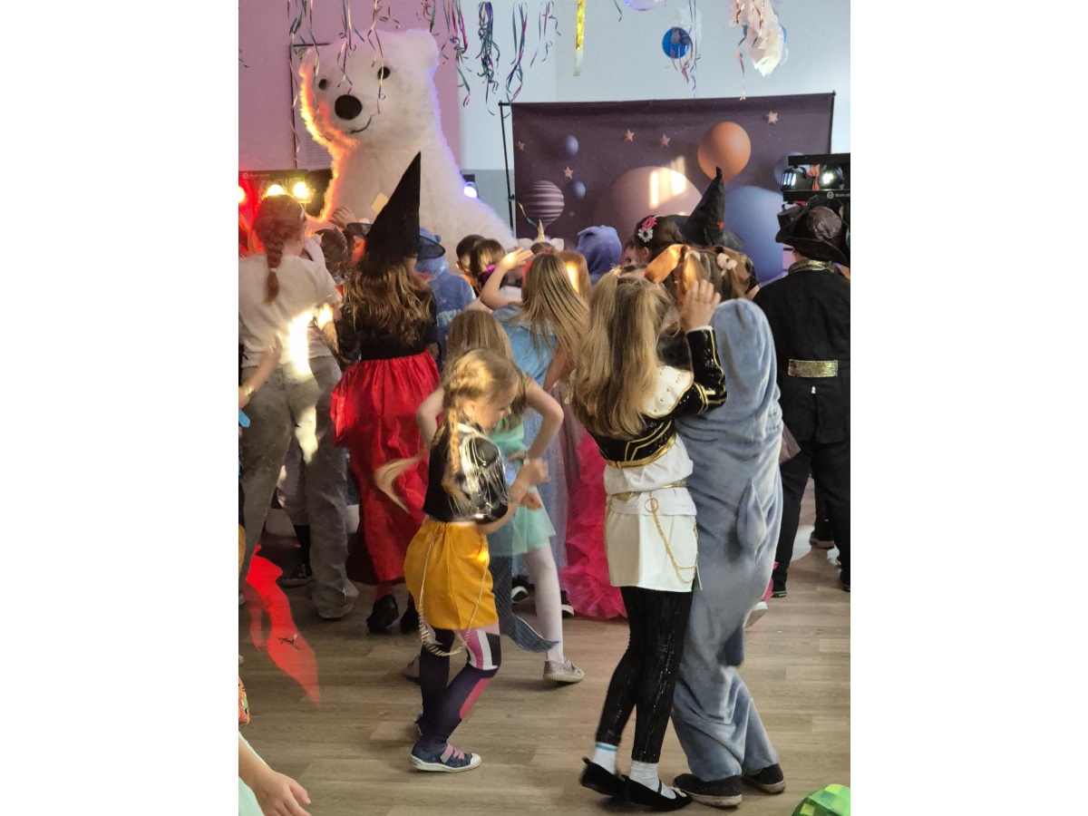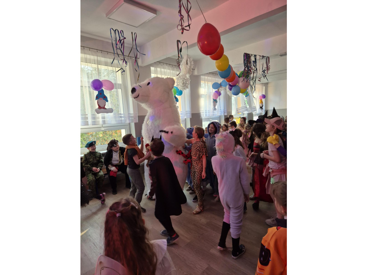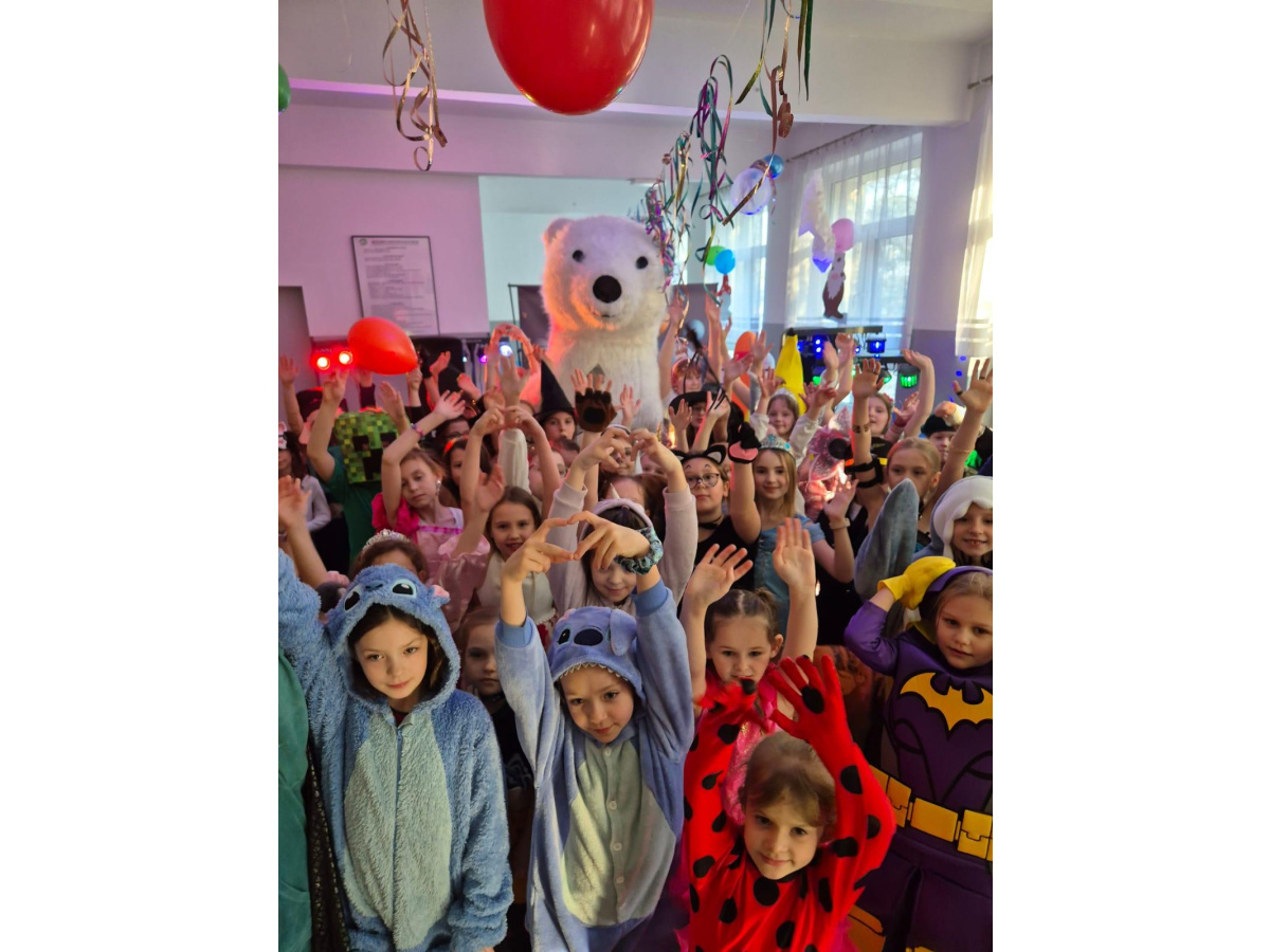 Dodatkową atrakcją był wyjątkowy gość – wielki miś, który chętnie bawił się z uczniami i pozował do pamiątkowych zdjęć. Bal był pełen radości, śmiechu i niezapomnianych chwil.
