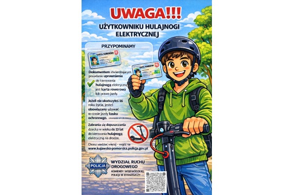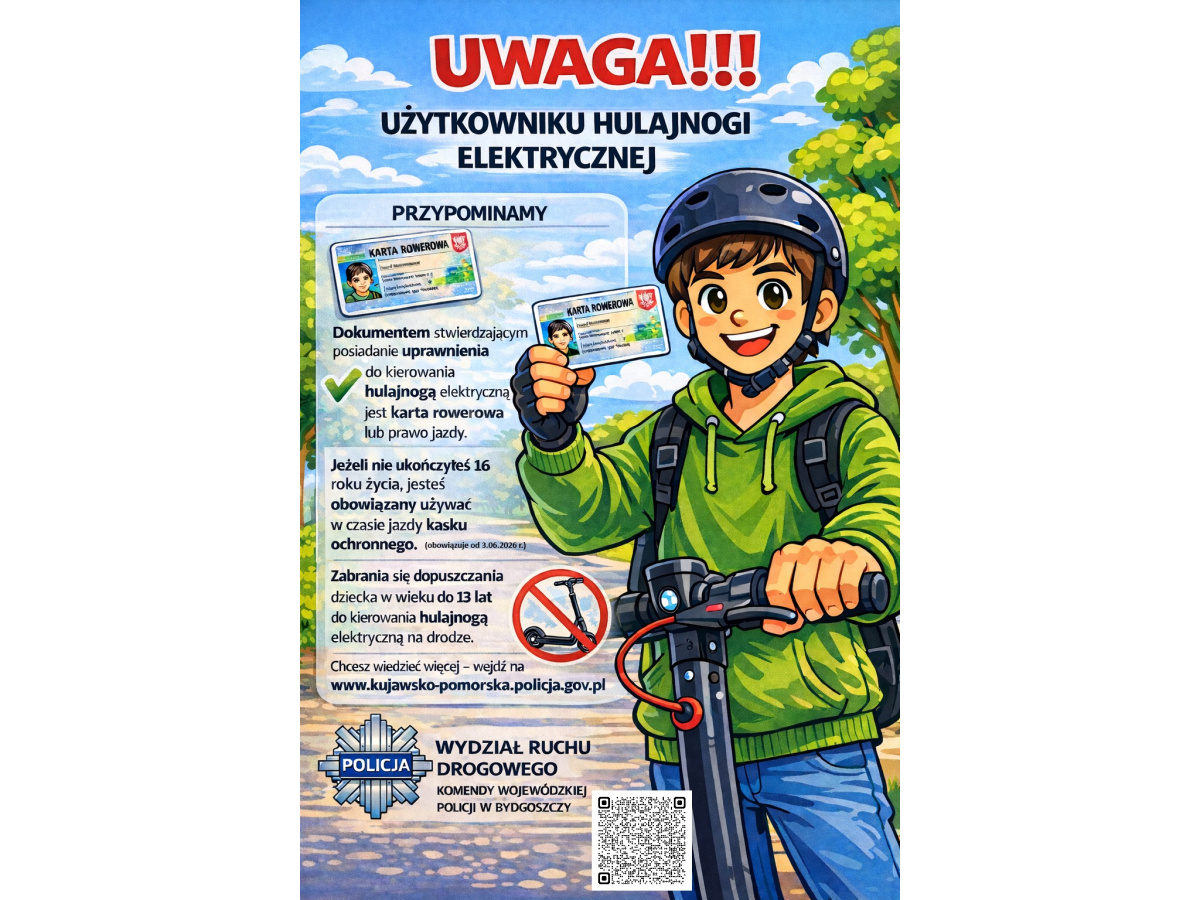 Na podstawie materiałów przygotowanych przez Komendę Wojewódzką Policji w Bydgoszczy przypominamy o najważniejszych zasadach dotyczących korzystania z hulajnóg elektrycznych.