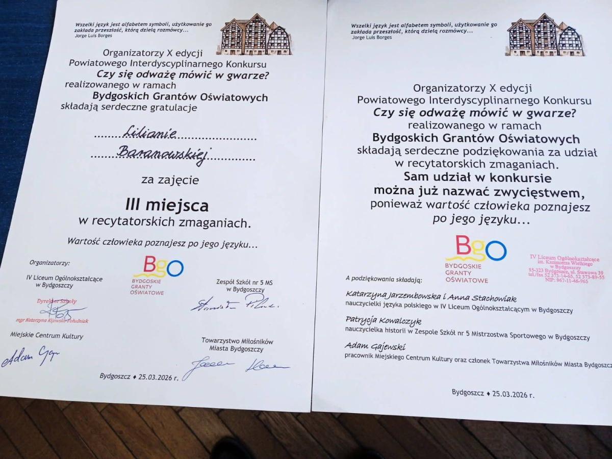 Nasze uczennice, Liliana Baranowska oraz Iga Konieczna, recenzja recytowały teksty w gwarze bydgoskiej podczas X Powiatowego Interdyscyplinarnego Konkursu pt. "Czy odważę się mówić w gwarze?", organizowanego przez Towarzystwo Miłośników Miasta Bydgoszczy, IV Liceum Ogólnokształcące i XV Liceum Ogólnokształcące. Dziewczynki z klasy 6 zajęły III miejsce, pięknie recytując oryginalne teksty w gwarze. Gratulujemy! Opiekunką zdolnych uczennic jest Pani Katarzyna Cemel.