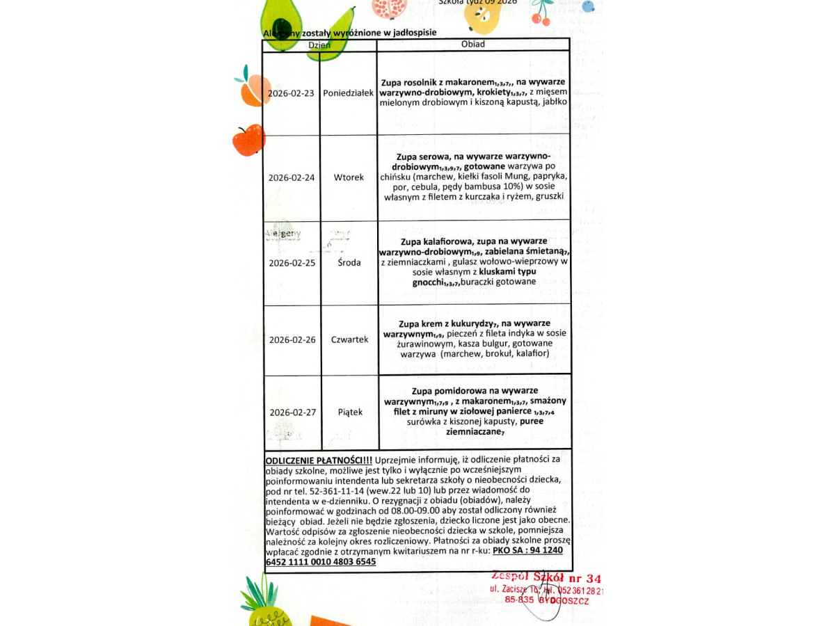 Oto jadłospis naszej szkolnej stołówki na najbliższy tydzień. Prosimy o terminowe płatności za obiady w całym roku szkolnym.