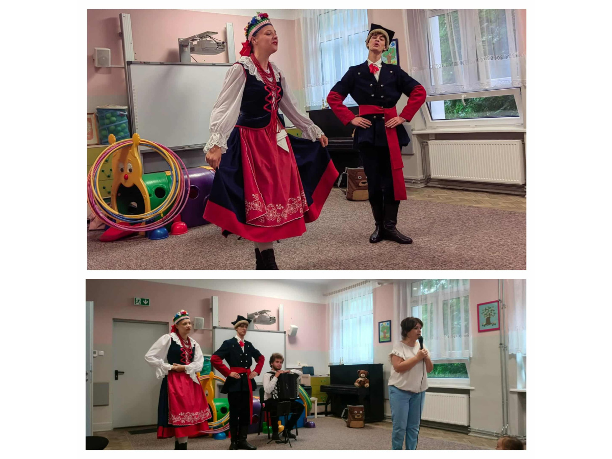 W dniu 19 września gościliśmy pierwszy raz w nowym roku szkolnym artystów współpracujących z Filharmonią Pomorską, a także parę taneczną z Zespołu Pieśni i Tańca Ziemi Bydgoskiej. Koncert prowadziła znana nam już z wcześniejszych spotkań sympatyczna pani Ada. Podczas koncertu poznaliśmy nowy instrument akordeon, jego wygląd, brzmienie i sposób grania oraz wysłuchaliśmy kilku utworów granych na tym właśnie instrumencie. Ponadto para taneczna przedstawiła nam kilka tańców ludowych i zaprezentowała swoje przepiękne, kolorowe stroje. Na zakończenie spotkania spróbowaliśmy jeszcze swoich umiejętności muzycznych grając na instrumentach perkusyjnych. Przedszkolaki wysłuchały koncertu z ogromnym zainteresowaniem i nagrodziły artystów gromkimi brawami! Wszyscy już z niecierpliwością czekamy na kolejne spotkanie!