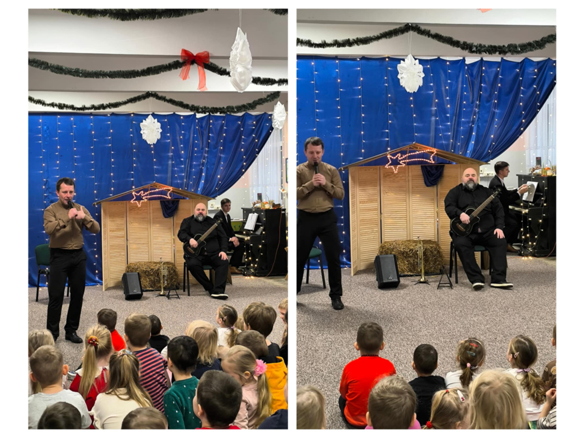 Dnia 17 grudnia odbył się w naszym przedszkolu przepiękny, klimatyczny koncert w wykonaniu artystów muzyków współpracujących z Filharmonią Pomorską pt. „Święta tuż, tuż!”. Podczas spotkania dzieci poznały utwór muzyki klasycznej „Zima” z cyklu „Cztery pory roku” Antonio Vivaldiego i wysłuchały innych świątecznych utworów granych na trąbce. Nie zabrakło także wspólnego śpiewania kolęd i zimowych piosenek oraz grania na instrumentach perkusyjnych. Małym słuchaczom koncert bardzo się podobał, a jego repertuar zdecydowanie wprowadził wszystkich w przedświąteczny nastrój!