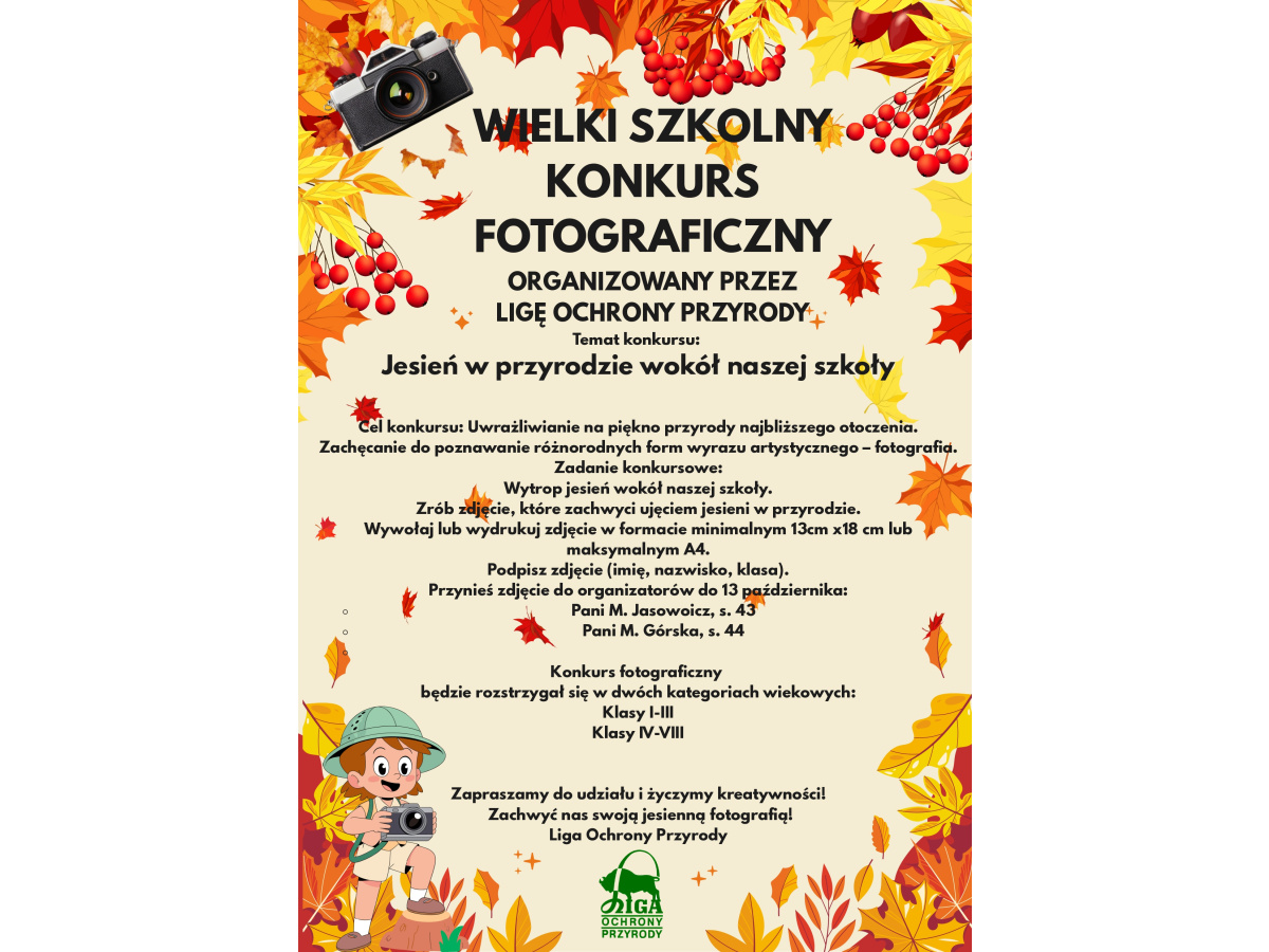 Liga Ochrony Przyrody ma przyjemność zaprosić do udziału w Wielkim Szkolnym Konkursie Fotograficznym. Temat to "jesień w przyrodzie wokół naszej szkoły". Należy zrobić, wywołać i przynieść zdjęcie nawiązujące do tematu konkursu. Konkurs organizują Pani Monika Jasudowicz i Pani Magdalena Górska. Prosimy o zapoznanie się z regulaminem.