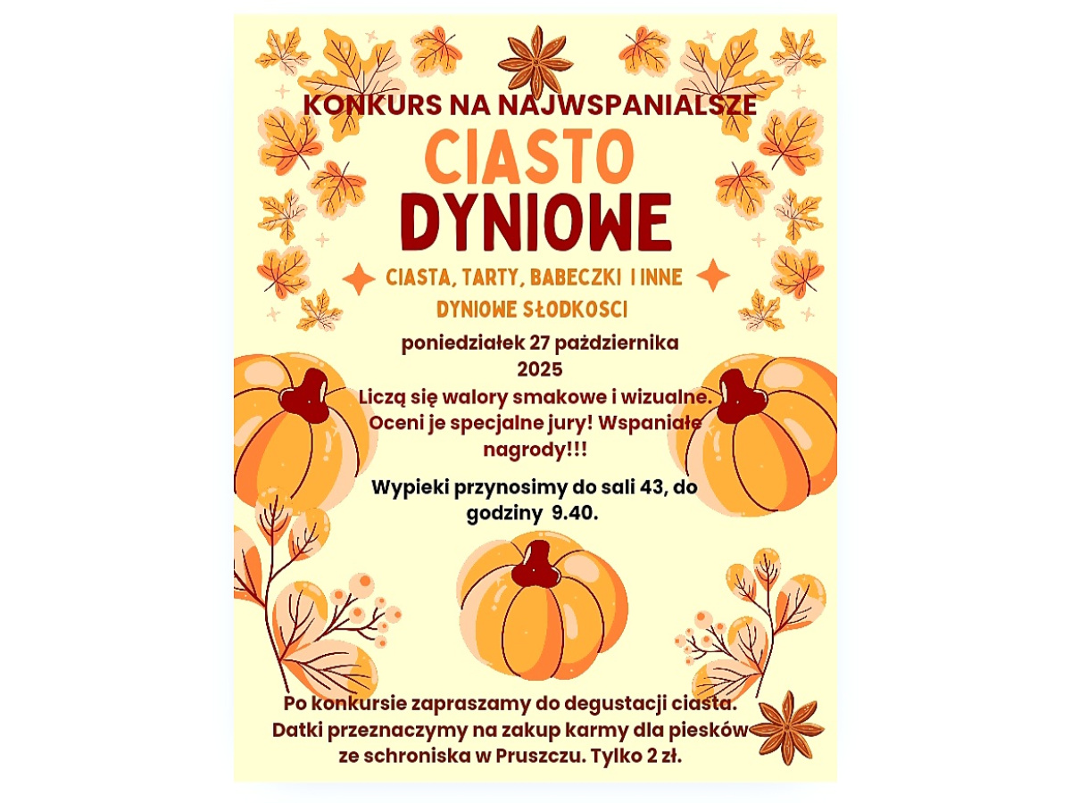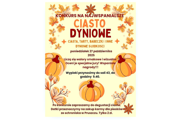 Ogłaszamy konkurs na najwspanialsze ciasto dyniowe. Aby wziąć udział, należy przygotować i przynieść dyniowe ciasto, tartę lub babeczki. Konkurs odbędzie się 27 października. Wypieki przynosimy tego dnia do sali 43, do godziny 9:40. Ocenione zostaną walory smakowe i wizualne. Po konkursie zapraszamy na degustację słodkości w cenie 2 zł za porcję. Uzbierane środki przeznaczymy na zakup karmy dla psów ze schroniska w Pruszczu