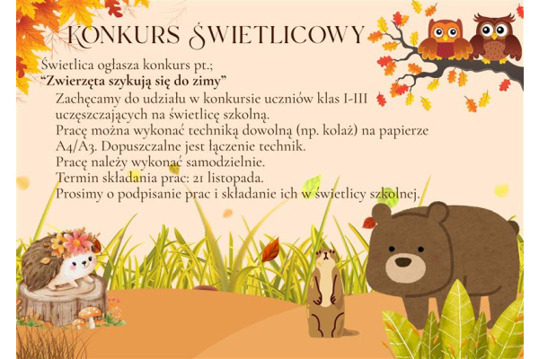 Serdecznie zapraszamy uczniów świetlicy do udziału w konkursie plastycznym pt. „Zwierzęta szykują się do zimy”! To doskonała okazja, aby połączyć kreatywność z wiedzą o przyrodzie i pokazać, jak nasi mali przyjaciele przygotowują się na nadejście chłodnych dni.