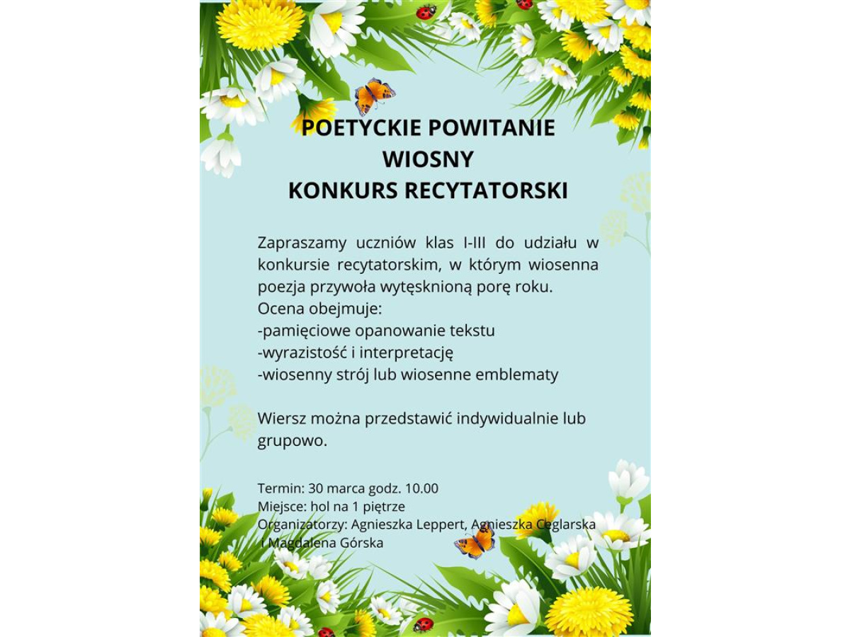 Zapraszamy uczniów klas I–III naszej szkoły do udziału w konkursie recytatorskim, w którym wiosenna poezja przywoła wytęsknioną porę roku. Oceniane będą pamięciowe opanowanie tekstu, wyrazistość i interpretacja, a także wiosenny strój lub wiosenne emblematy. Wiersz można przedstawić indywidualnie lub grupowo. Termin: 30 marca, godz. 10:00. Miejsce: hol I piętra. Konkurs organizują panie: Agnieszka Leppert, Agnieszka Ceglarska i Magdalena Górska.