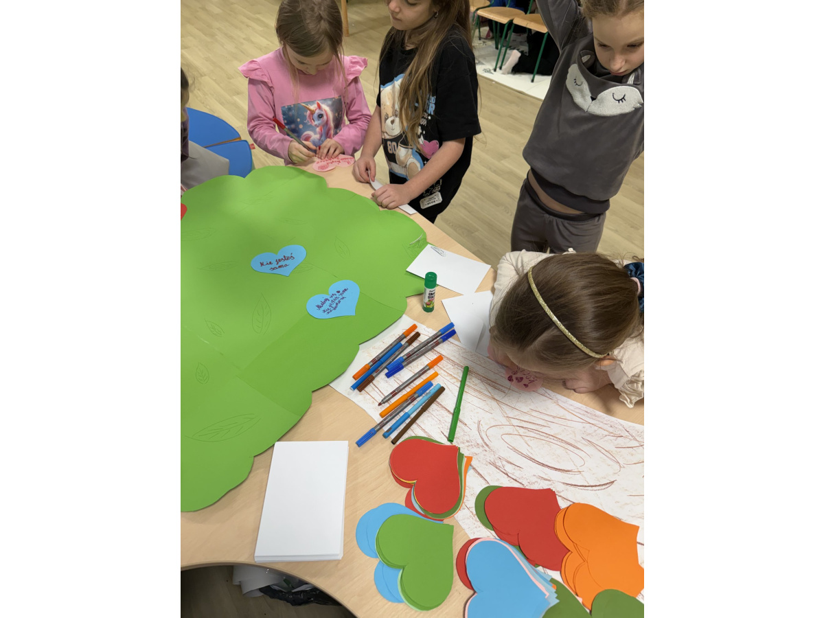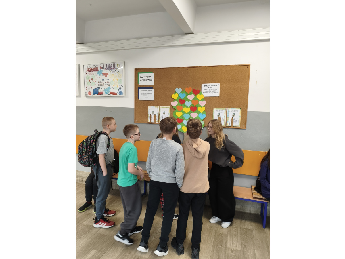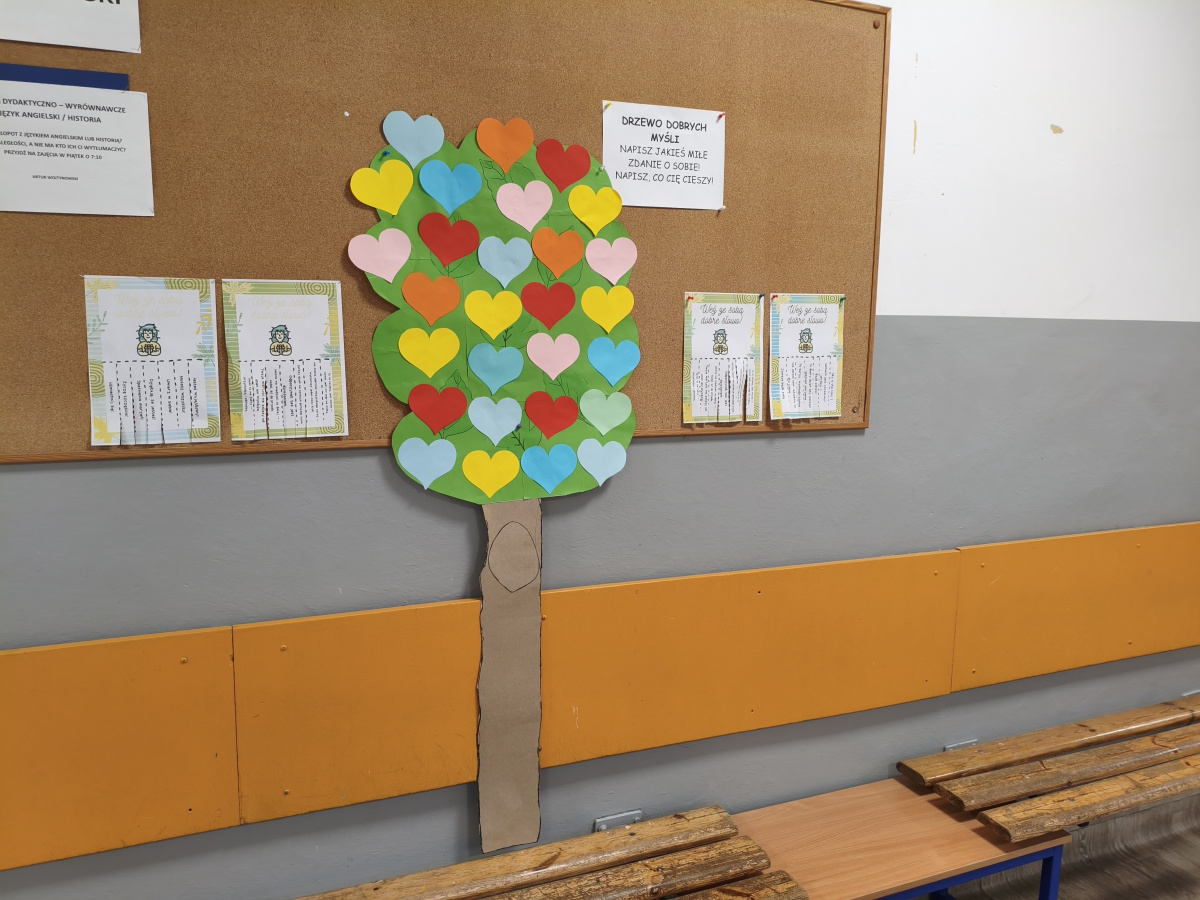 Najmłodsi uczniowie włączyli się w działania twórcze, przygotowując plakaty promujące dobre samopoczucie, życzliwość i wiarę w siebie. Szczególnym zainteresowaniem cieszyło się „Drzewo dobrych myśli”, które pojawiło się na holu drugiego piętra. Uczniowie mogli umieszczać na nim pozytywne wypowiedzi o sobie, słowa wsparcia dla innych oraz zapisy swoich marzeń i celów.