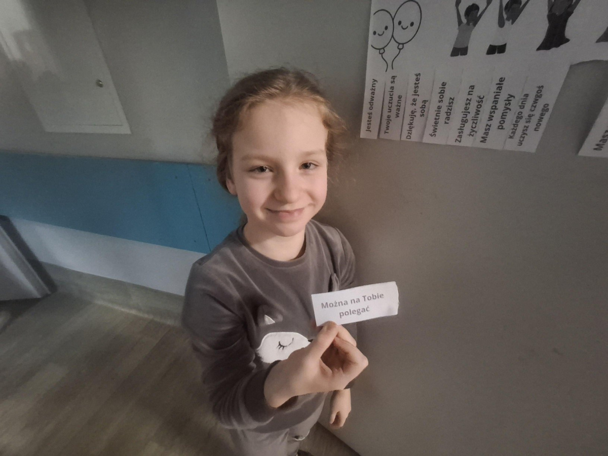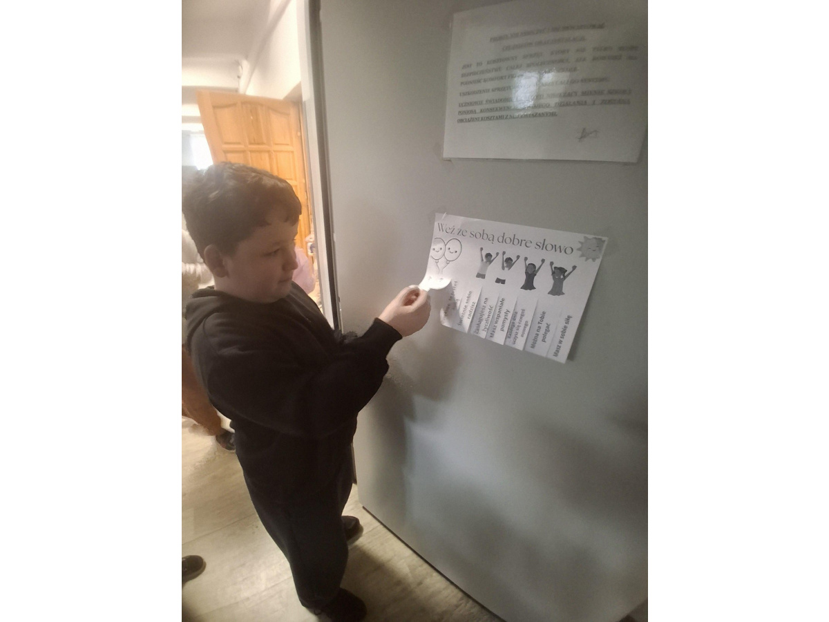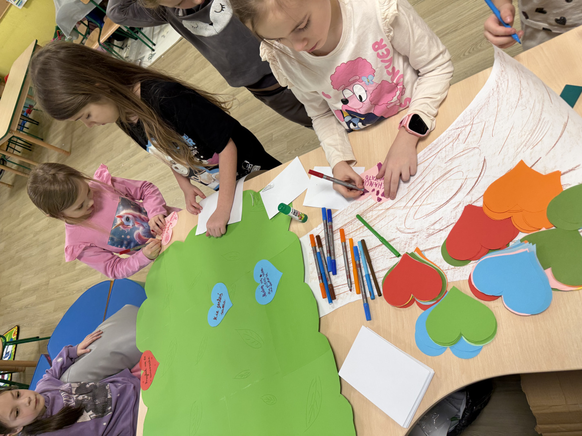 Najmłodsi uczniowie włączyli się w działania twórcze, przygotowując plakaty promujące dobre samopoczucie, życzliwość i wiarę w siebie. Szczególnym zainteresowaniem cieszyło się „Drzewo dobrych myśli”, które pojawiło się na holu drugiego piętra. Uczniowie mogli umieszczać na nim pozytywne wypowiedzi o sobie, słowa wsparcia dla innych oraz zapisy swoich marzeń i celów.