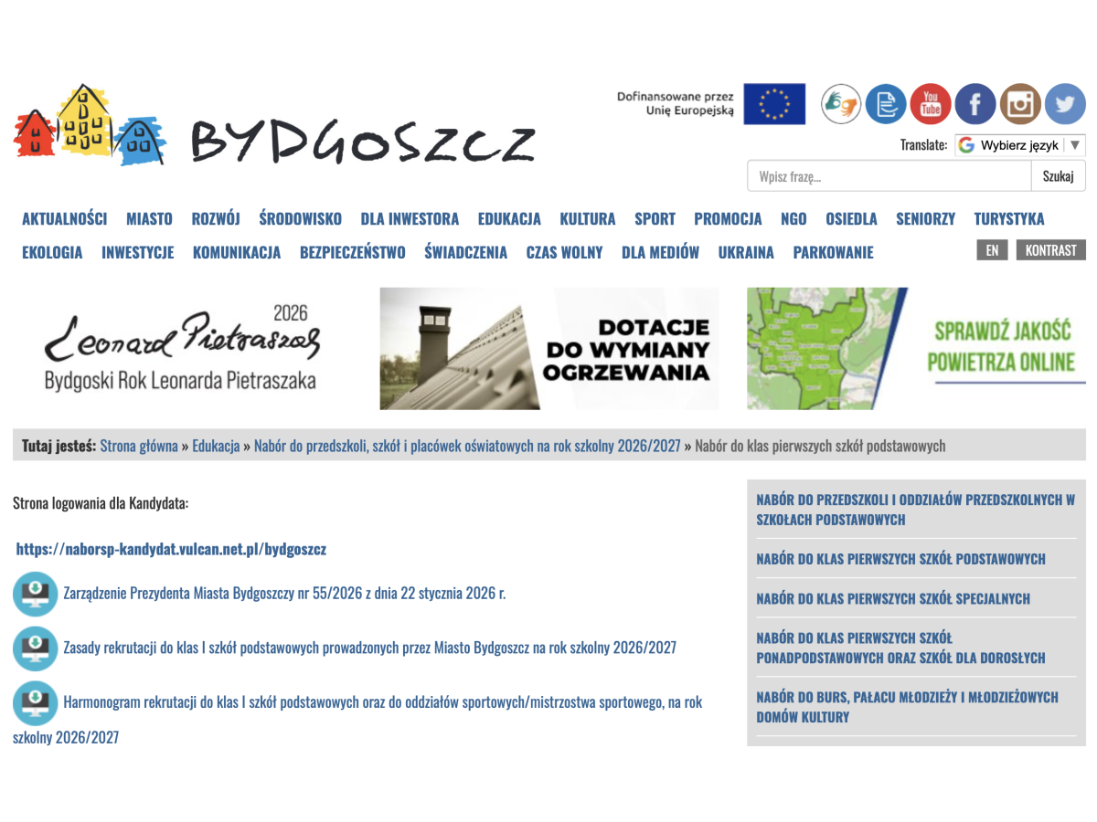 Nabór do placówek oświatowych prowadzonych przez Miasto Bydgoszcz odbywa się wyłącznie drogą elektroniczną pod linkiem: https://naborsp-kandydat.vulcan.net.pl/bydgoszcz