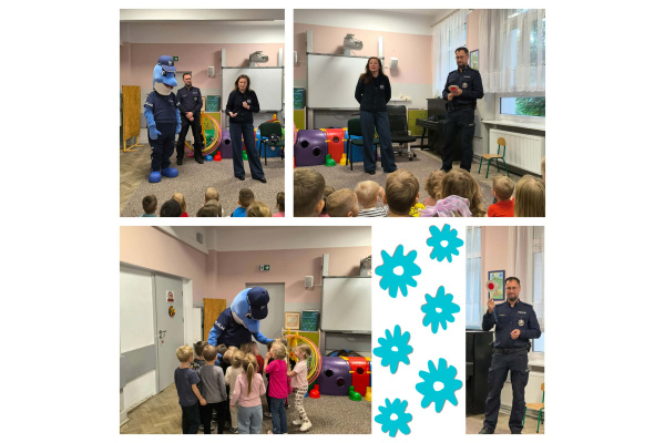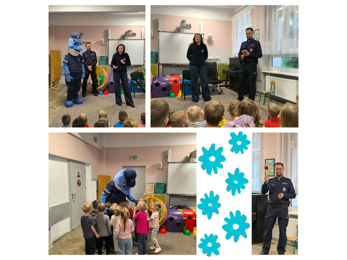 Również w dniu 8 października odwiedzili nas policjanci z Komisariatu Policji Bydgoszcz-Wyżyny wraz z policyjną maskotką – delfinkiem Polfinkiem. Podczas spotkania dzieci miały możliwość zapoznać się z pracą policjanta, ale przede wszystkim poznać i utrwalić podstawowe zasady bezpieczeństwa. Funkcjonariusze uczyli naszych wychowanków zasad bezpiecznego uczestnictwa w ruchu drogowym jako piesi, udzielali rad na temat bezpiecznego zachowania się w domu oraz odpowiedniego postępowania, kiedy coś się stanie, a także dali im kilka cennych wskazówek dotyczących bezpieczeństwa w przypadku spotkania z nieznajomymi.Spotkanie z policjantami zakończyło się miłym akcentem, ponieważ każda grupa mogła spotkać się z delfinkiem Polfinkiem, przytulić się do niego i przybić z nim piątkę! Na pewno zapamiętamy wszystkie zasady bezpieczeństwa, bo bezpieczeństwo to bardzo ważna rzecz!