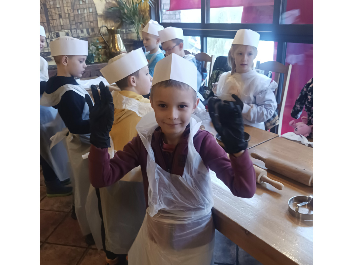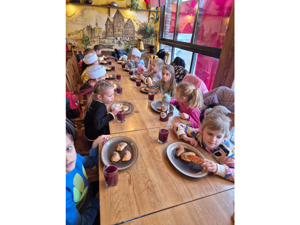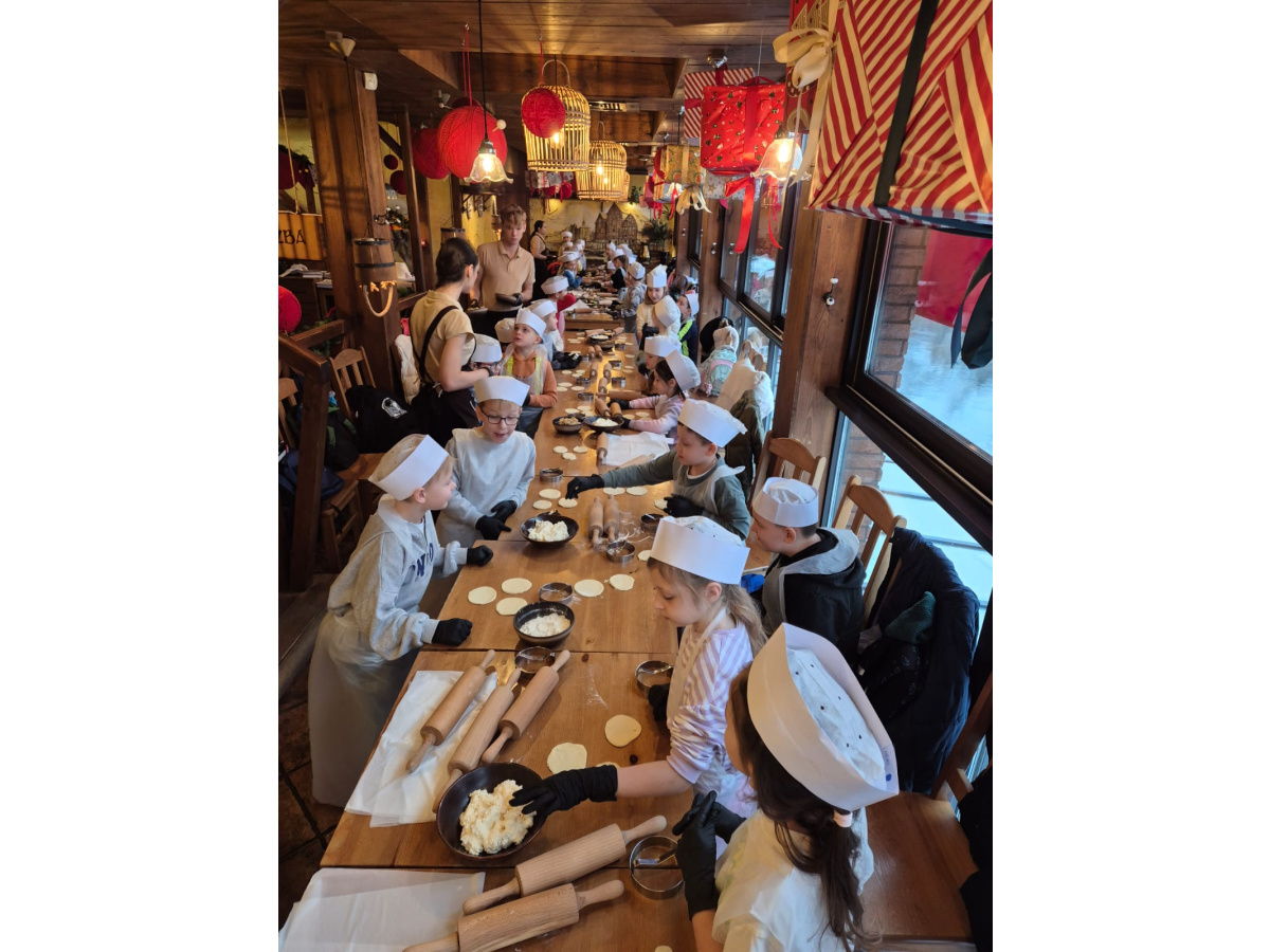 27 listopada klasy pierwsze wybrały się na wyjątkowe warsztaty kulinarne do Pierogarni Stary Młyn. Uczniowie mieli okazję poznać tajniki tradycyjnego lepienia pierogów – od przygotowania ciasta, przez formowanie farszu, aż po nadawanie im kształtu. Z wielkim zaangażowaniem i radością tworzyli własne pierogi, ucząc się cierpliwości i precyzji. Największą atrakcją było jednak wspólne kosztowanie upieczonych przysmaków, które smakowały jeszcze lepiej dzięki własnej pracy.