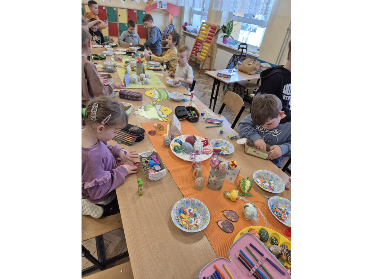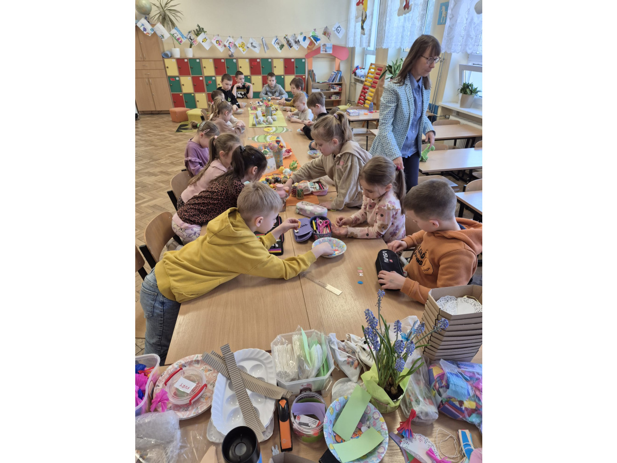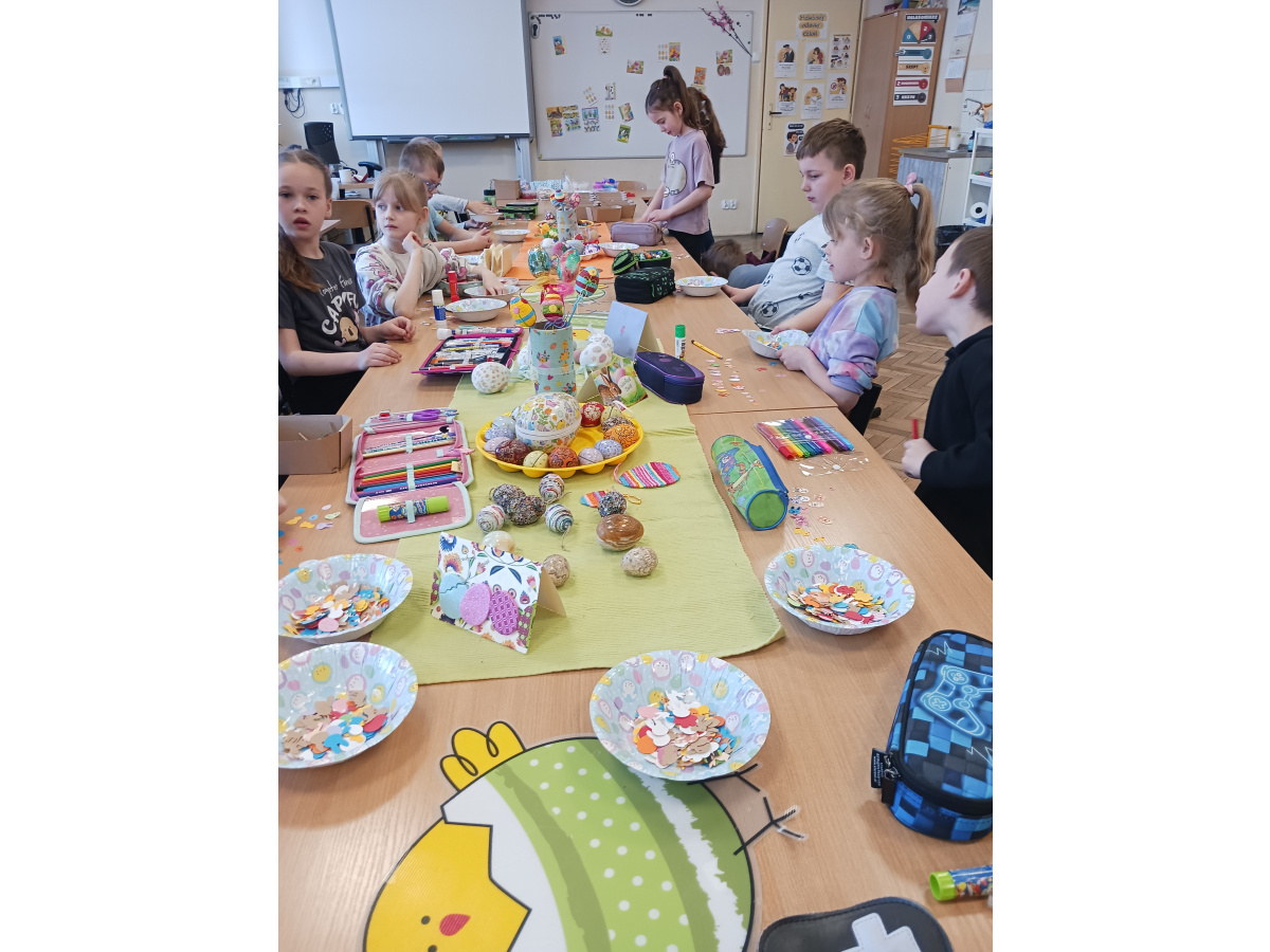 Klasy pierwsze w naszej szkole wzięły udział w twórczych warsztatach wielkanocnych. Dzieci z zaangażowaniem wykonywały kolorowe ozdoby, poznając tradycje świąteczne i rozwijając swoje umiejętności plastyczne. Wspólna praca przyniosła im wiele radości i satysfakcji, a wykonane dekoracje wprowadziły świąteczny nastrój w szkolne sale.
